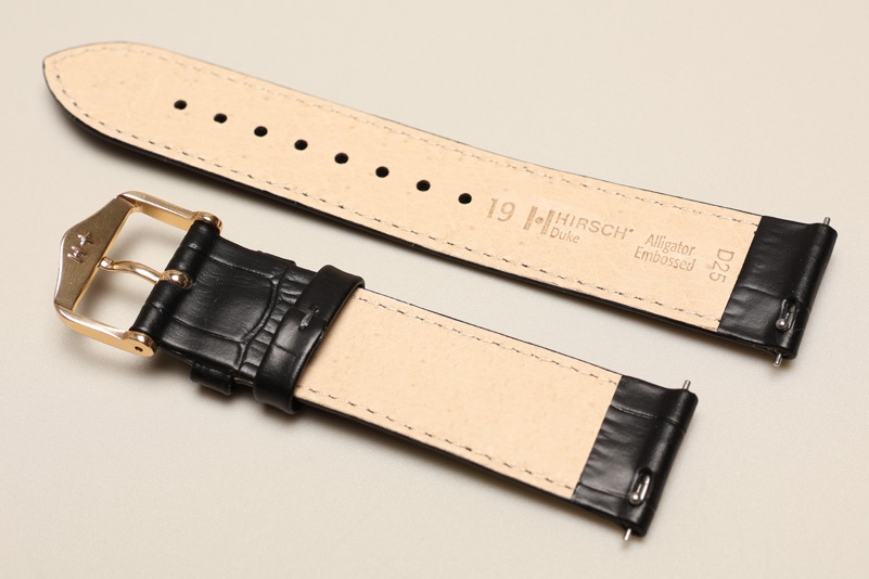 Do dużych zegarków z mocowaniem 18mm. Wykonany ze skóry cielęcej, tłoczonej na wzór skóry aligatora. Przeszywany lekko kontrastującą nicią. Pogrubiany przy mocowaniu do 4,5mm, dalej pasek cieniowany do 2,5mm. Podwójna szlufka, metalowa klamerka. Wbudowane teleskopy do szybkiej zmiany.