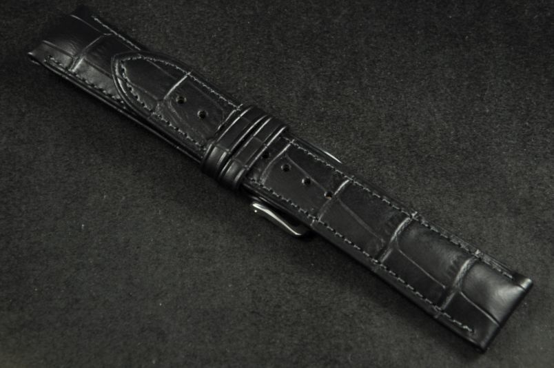 Do dużych zegarków z mocowaniem 20mm. Wykonany ze skóry cielęcej, tłoczonej na wzór skóry aligatora. Przeszywany nicią w kolorze paska. Pogrubiany przy mocowaniu do 4,4mm, dalej pasek cieniowany do 2,5mm. Podwójna szlufka, metalowa klamerka. Rozmiar M. Wbudowane szybkie teleskopy do łatwej zmiany.