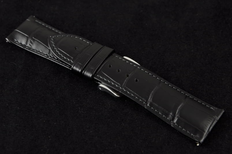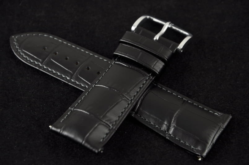 Do dużych zegarków z mocowaniem 24mm. Wykonany ze skóry cielęcej, tłoczonej na wzór skóry aligatora. Przeszywany nicią w kolorze paska. Pogrubiany przy mocowaniu do 4,4mm, dalej pasek cieniowany do 2,5mm. Wbudowane szybkie teleskopy do łatwiej zmiany. Podwójna szlufka, metalowa klamerka. Rozmiar M. Wbudowane szybkie teleskopy do łatwej zmiany.
