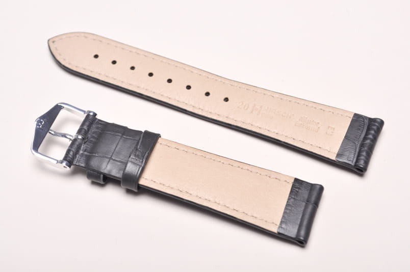 Do dużych zegarków z mocowaniem 20mm. Wykonany ze skóry cielęcej, tłoczonej na wzór skóry aligatora. Przeszywany nicią w kolorze paska. Pogrubiany przy mocowaniu do 4,4mm, dalej pasek cieniowany do 2,5mm. Podwójna szlufka, metalowa klamerka.