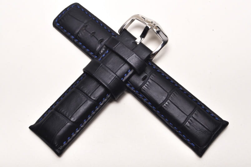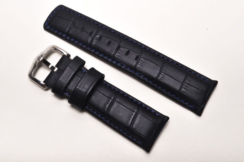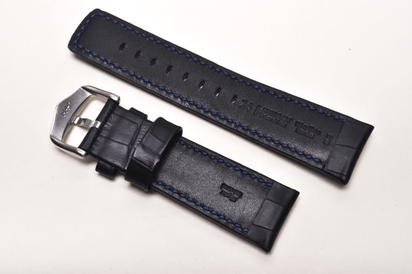 Wodoodporny pasek o sportowym charakterze. Wykonany ze skóry naturalnej tłoczonej na wzór skóry aligatora. Futrówka z gładkiej, czarnej skóry. Przeszywany niebieską, grubą nicią. Pogrubiany przy mocowaniu do 5,8mm, dalej pasek cieniowany do 4,2mm. Podwójna szlufka, stalowa klamerka.