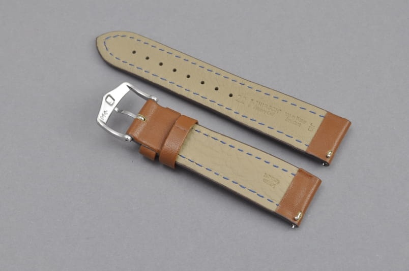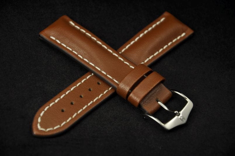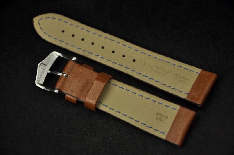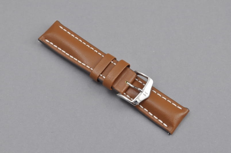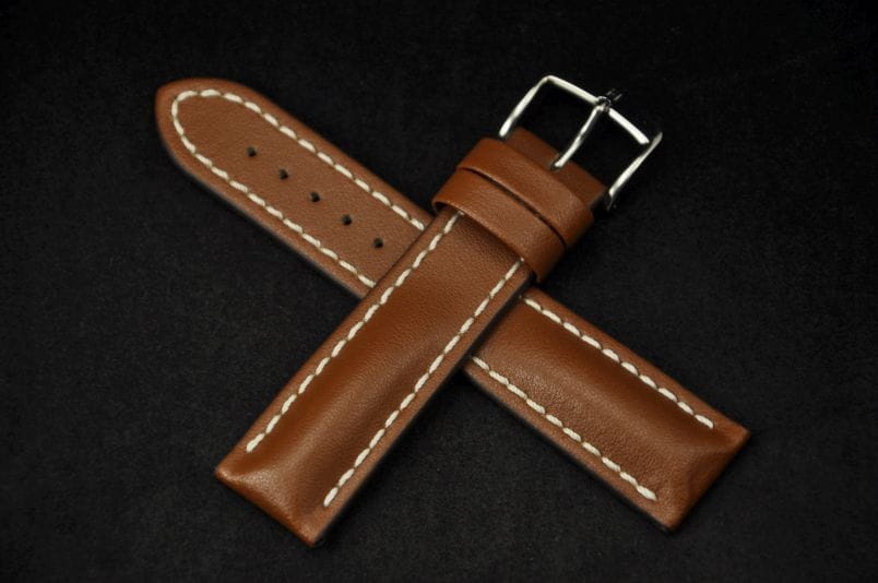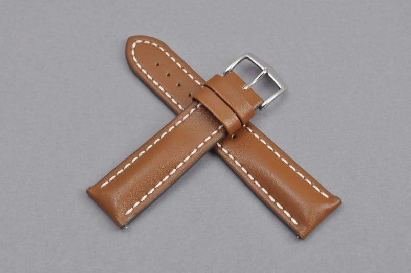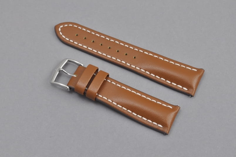 Wykonany ze skóry cielęcej o naturalnej strukturze. Futrówka typu Oysterglove Supersoft - miękka i miła w dotyku, a jednocześnie o właściwościach wodoodpornych. Przeszywany grubą białą nicią. Mocno pogrubiany przy mocowaniu do 6,7mm, dalej pasek cieniowany do 3mm. Podwójna szlufka, metalowa klamerka. Pasek jest wodoodporny. W pasku wbudowane są szybkie teleskopy