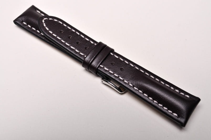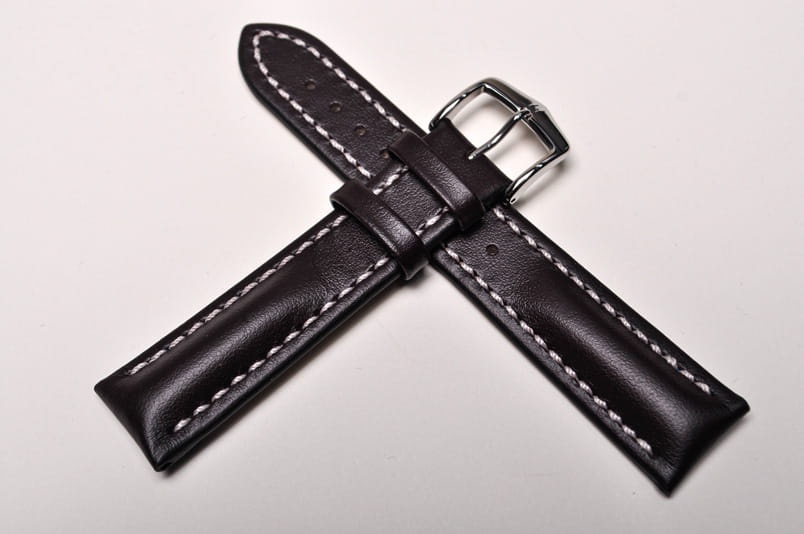 Wykonany ze skóry cielęcej o naturalnej strukturze. Futrówka typu Oysterglove Supersoft - miękka i miła w dotyku, a jednocześnie o właściwościach wodoodpornych. Przeszywany grubą białą nicią. Mocno pogrubiany przy mocowaniu do 6,7mm, dalej pasek cieniowany do 3mm. Podwójna szlufka, metalowa klamerka. Pasek jest wodoodporny. Piękny zamiennik do sportowych, dużych zegarków typu Omega czy Breitling.