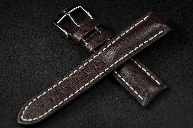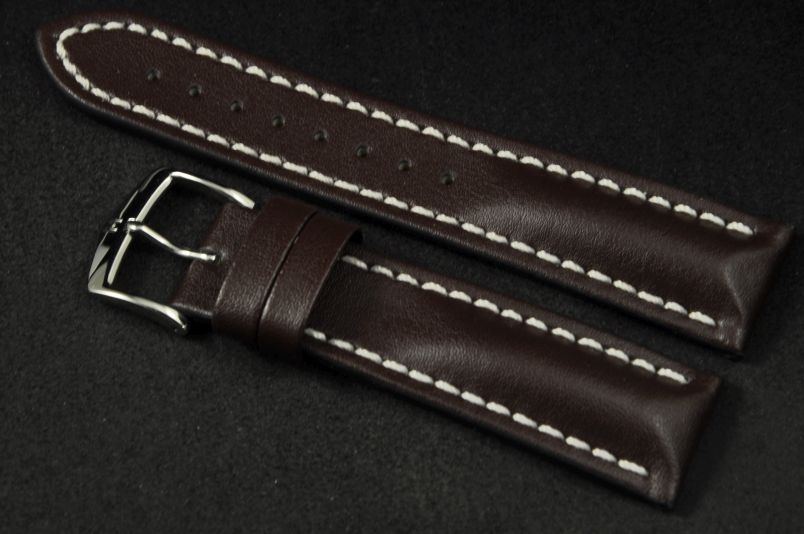 Wykonany ze skóry cielęcej o naturalnej strukturze. Futrówka typu Oysterglove Supersoft - miękka i miła w dotyku, a jednocześnie o właściwościach wodoodpornych. Przeszywany grubą białą nicią. Mocno pogrubiany przy mocowaniu do 6,7mm, dalej pasek cieniowany do 3mm. Podwójna szlufka, metalowa klamerka. Pasek jest wodoodporny. Piękny zamiennik do sportowych, dużych zegarków typu Omega czy Breitling.