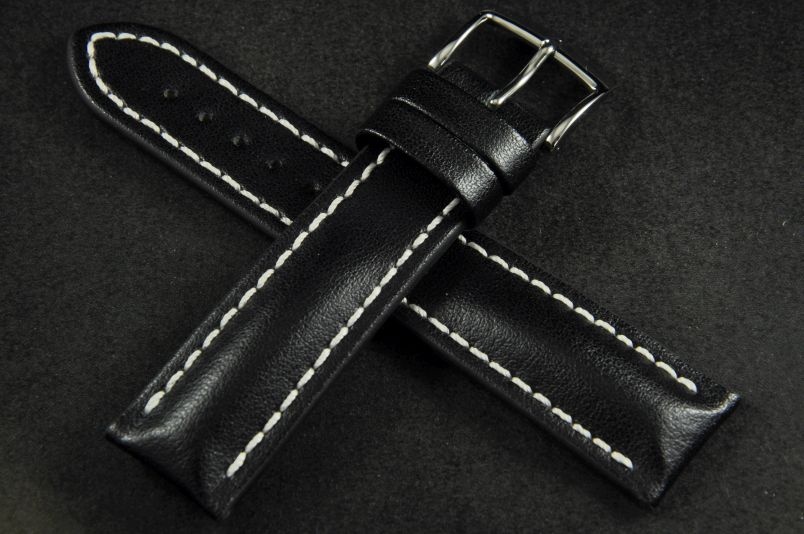 Wykonany ze skóry cielęcej o naturalnej strukturze. Futrówka typu Oysterglove Supersoft - miękka i miła w dotyku, a jednocześnie o właściwościach wodoodpornych. Przeszywanyr grubą białą nicią. Mocno pogrubiany przy mocowaniu do 6,7mm, dalej pasek cieniowany do 3mm. Podwójna szlufka, metalowa klamerka. Pasek jest wodoodporny. Piękny zamiennik do sportowych, dużych zegarków typu Omega czy Breitling.