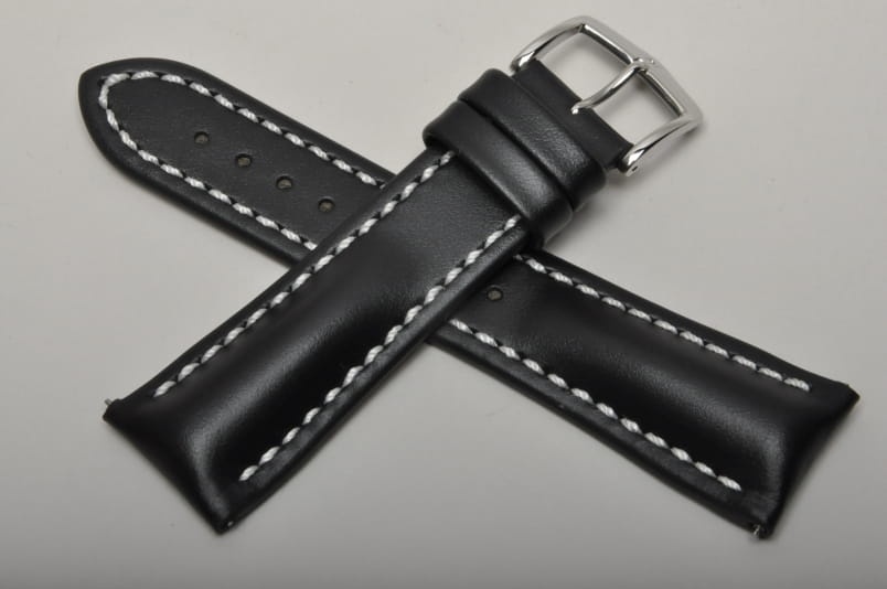 Wykonany ze skóry cielęcej o naturalnej strukturze. Futrówka typu Oysterglove Supersoft - miękka i miła w dotyku, a jednocześnie o właściwościach wodoodpornych. Przeszywany grubą białą nicią. Mocno pogrubiany przy mocowaniu do 8mm, dalej pasek cieniowany do 3mm. Podwójna szlufka, metalowa klamerka. Pasek jest wodoodporny. Piękny zamiennik do sportowych, dużych zegarków typu Omega czy Breitling.