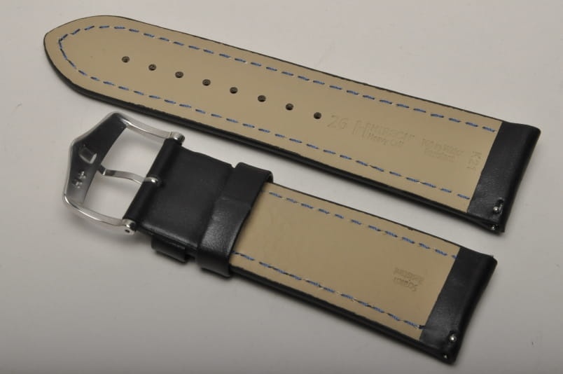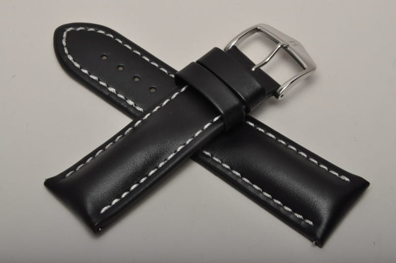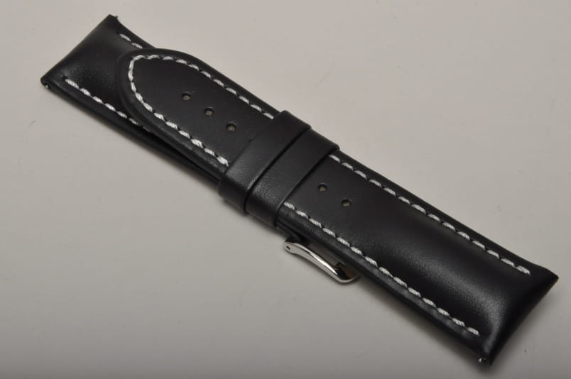 Wykonany ze skóry cielęcej o naturalnej strukturze. Futrówka typu Oysterglove Supersoft - miękka i miła w dotyku, a jednocześnie o właściwościach wodoodpornych. Przeszywany grubą białą nicią. Mocno pogrubiany przy mocowaniu do 8mm, dalej pasek cieniowany do 3,5mm. Podwójna szlufka, metalowa klamerka. Pasek jest wodoodporny. Piękny zamiennik do sportowych, dużych zegarków typu Omega czy Breitling.