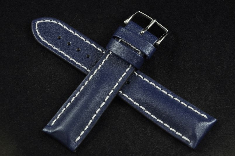 Wykonany ze skóry cielęcej o naturalnej strukturze. Futrówka typu Oysterglove Supersoft - miękka i miła w dotyku, a jednocześnie o właściwościach wodoodpornych. Przeszywany grubą białą nicią. Mocno pogrubiany przy mocowaniu do 6,7mm, dalej pasek cieniowany do 3mm. Podwójna szlufka, metalowa klamerka. Pasek jest wodoodporny. Piękny zamiennik do sportowych, dużych zegarków typu Omega czy Breitling.