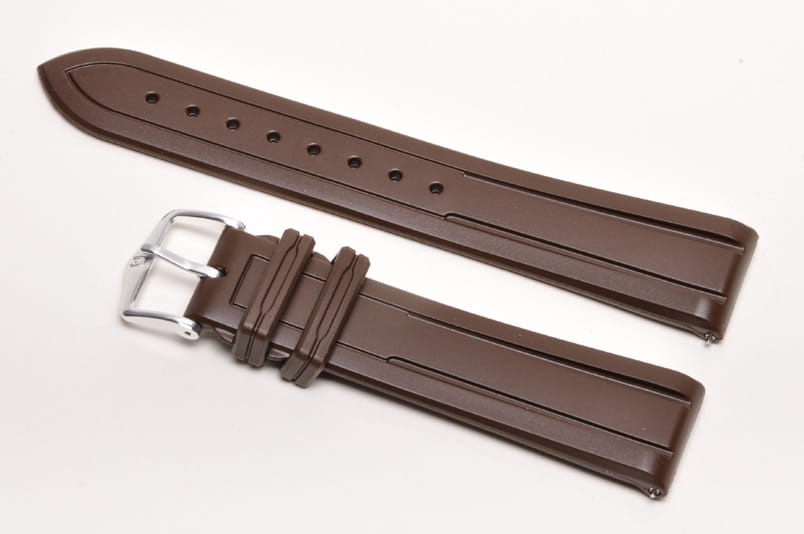 Pasek wykonany z wysokiej jakości kauczuku. Pasek o lekko sportowym charakterze, ze żłobieniem. Całkowicie wodoodporny, elastyczny i wytrzymały na zerwanie i temperaturę. Antyalergiczny. Pogrubiany przy mocowaniu do 5,9mm, dalej pasek cieniowany do 3,7mm. Podwójna szlufka, aluminiowa klamerka. Wbudowane teleskopy do szybkiego montażu.