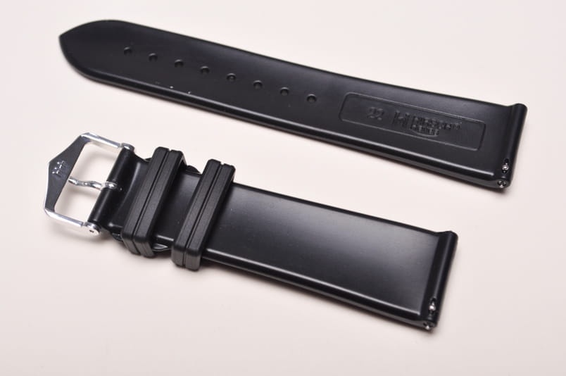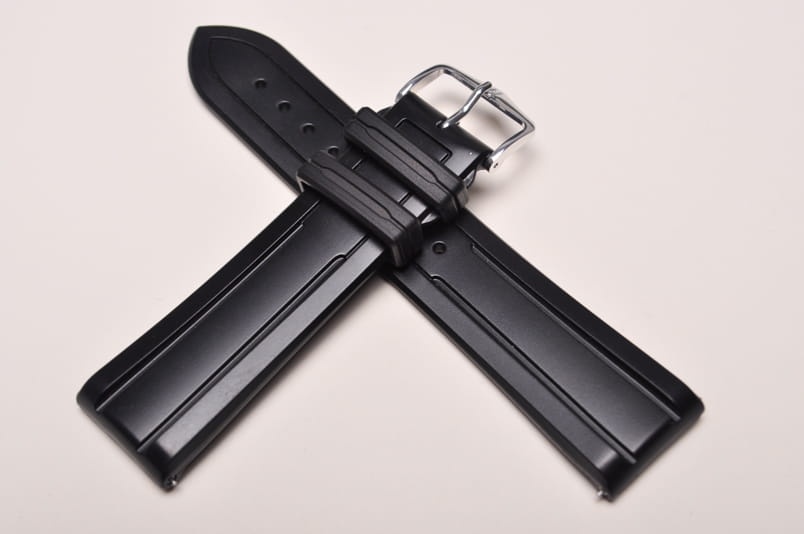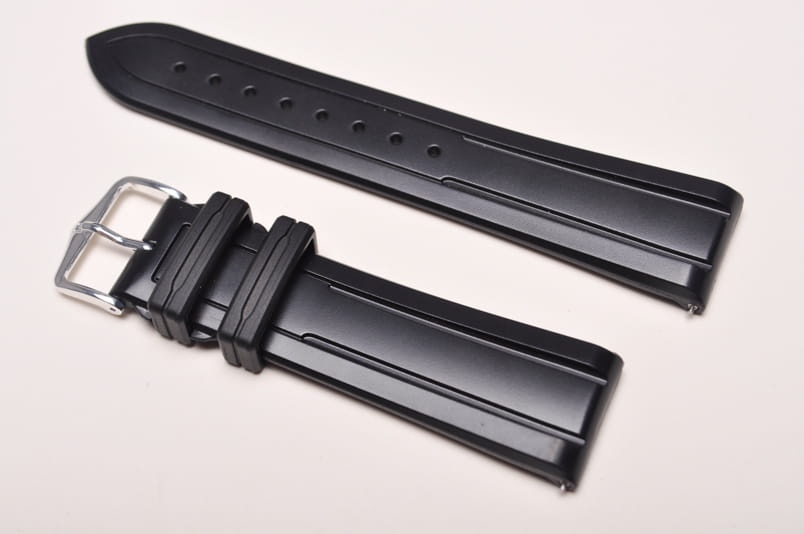Pasek wykonany z wysokiej jakości kauczuku. Pasek o lekko sportowym charakterze, ze żłobieniem. Całkowicie wodoodporny, elastyczny i wytrzymały na zerwanie i temperaturę. Antyalergiczny. Pogrubiany przy mocowaniu do 5,9mm, dalej pasek cieniowany do 3,7mm. Podwójna szlufka, aluminiowa klamerka. Wbudowane teleskopy do szybkiego montażu.