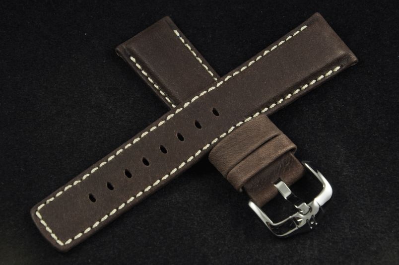 Wodoodporny pasek o sportowym charakterze. Wykonany ze skóry naturalnej o delikatnie widocznej strukturze. Futrówka z gładkiej, brązowej skóry. Przeszywany białą, grubą nicią. Pogrubiany przy mocowaniu do 5,5mm, dalej pasek cieniowany do 2,4mm. Podwójna szlufka, stalowa klamerka.