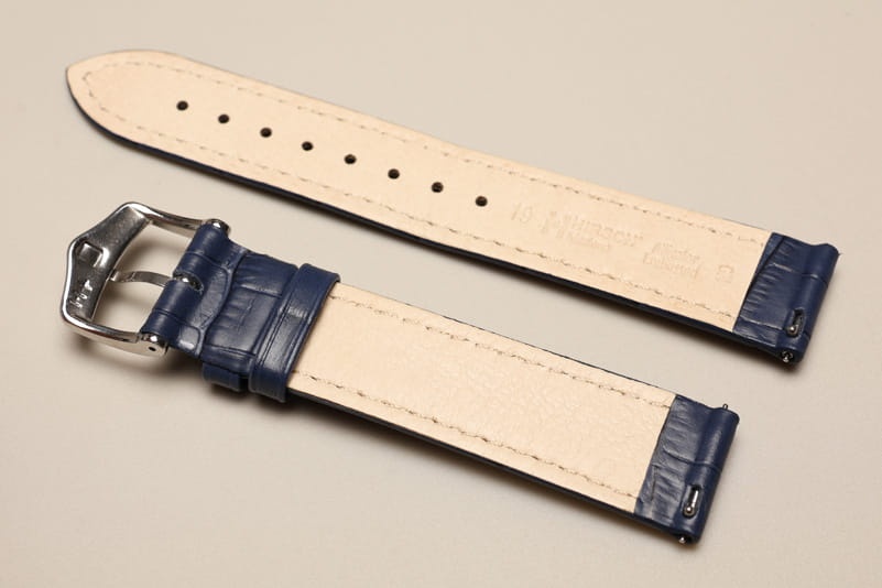 Do zegarków z mocowaniem 19mm. Wykonany ze skóry cielęcej, tłoczonej na wzór skóry aligatora. Przeszywany jasną, grubą nicią. Pogrubiany przy mocowaniu do 4,5mm, dalej pasek cieniowany do 2,5mm. Podwójna szlufka, stalowa klamerka. Wbudowane szybkie teleskopy.