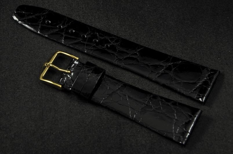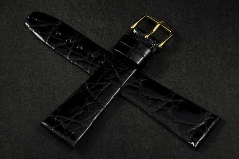Do zegarków z mocowaniem 20mm. Wykonany z oryginalnej skóry krokodyla. Płaski pasek, bez przeszyć, lakierowany. Licowa, gładka futrówka Silkglove w kolorze czarnym. Brzegi zawijane. Podwójna szlufka, metalowa klamerka. Pasek do klasycznych, płaskich i eleganckich zegarków.