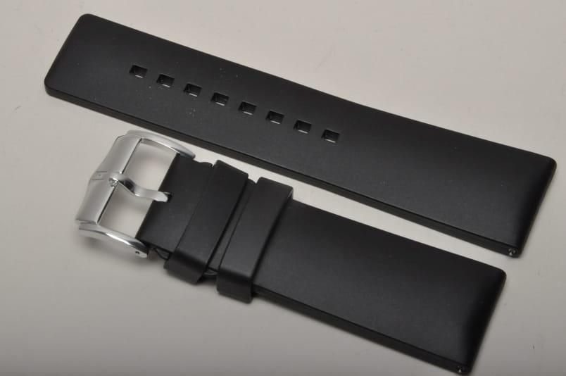 Pasek wykonany z wysokiej jakości kauczuku. Prosty, a zarazem bardzo funkcjonalny. Całkowicie wodoodporny, elastyczny i wytrzymały na zerwanie i temperaturę. Pogrubiany przy mocowaniu do 4,5mm, dalej pasek cieniowany do 3,6mm. Podwójna szlufka, aluminiowa klamerka. Wbudowane szybkie teleskopy do łatwiej zmiany.