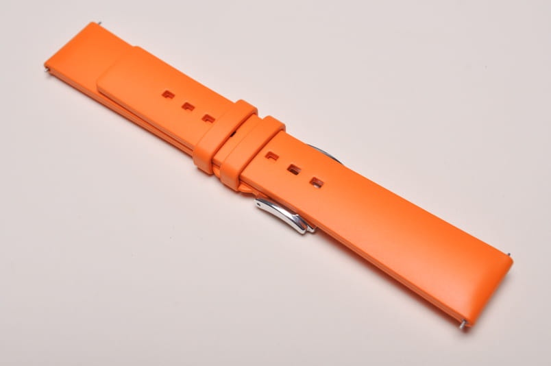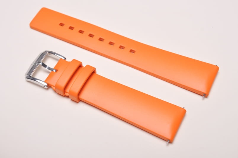 Pasek wykonany z wysokiej jakości kauczuku. Prosty, a zarazem bardzo funkcjonalny. Całkowicie wodoodporny, elastyczny i wytrzymały na zerwanie i temperaturę. Pogrubiany przy mocowaniu do 4,5mm, dalej pasek cieniowany do 3,6mm. Podwójna szlufka, aluminiowa klamerka. Wbudowane teleskopy do szybkiej zmiany.
