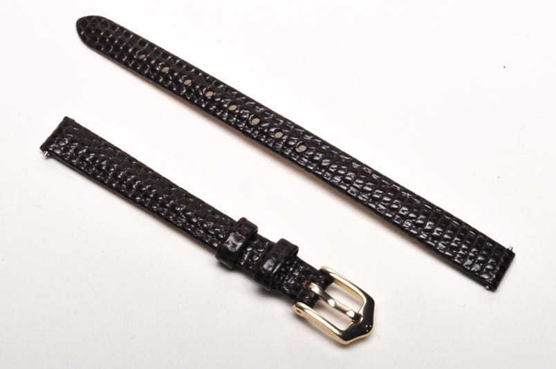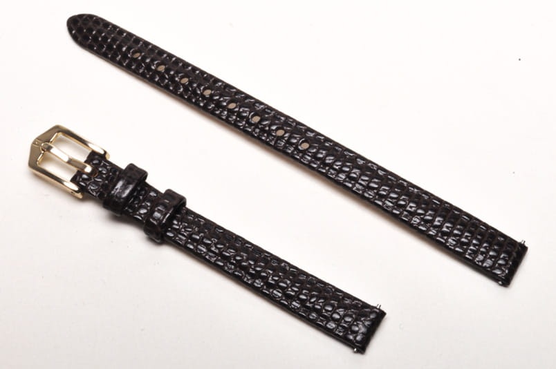 Do zegarków z mocowaniem 9mm. Wykonany ze skóry cielęcej, tłoczonej na wzór skóry jaszczurki. Klejony bez szwów. Pogrubiany przy mocowaniu do 3mm, dalej pasek cieniowany do 2,5mm. Podwójna szlufka, metalowa klamerka. Krótsza wersja M.