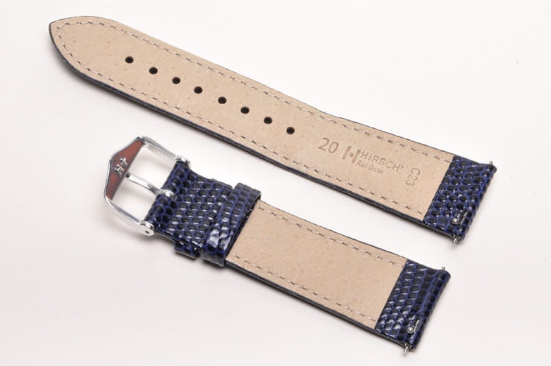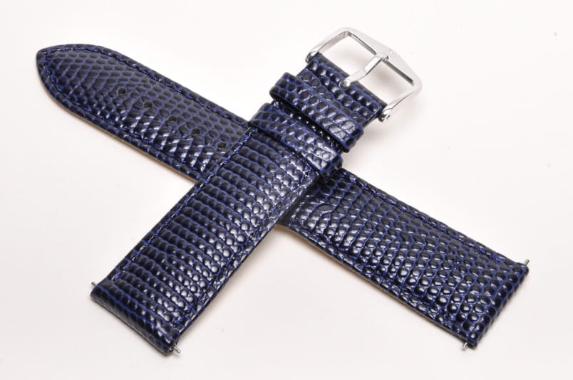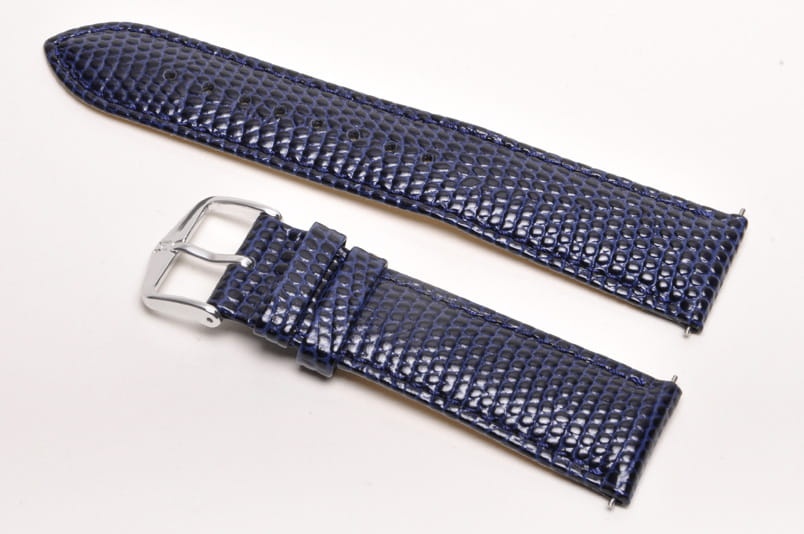 Do zegarków z mocowaniem 20mm. Wykonany ze skóry cielęcej, tłoczonej na wzór skóry jaszczurki. Przeszywany nicią pod kolor paska. Pogrubiany przy mocowaniu do 3mm, dalej pasek cieniowany do 2,5mm. Podwójna szlufka, metalowa klamerka. Krótsza wersja M.