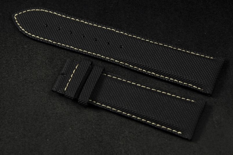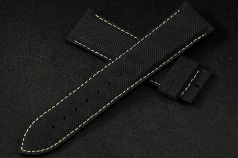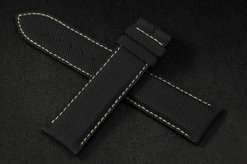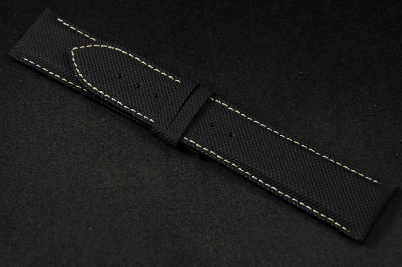 Wykonany ze skóry naturalnej tłoczonej w drobny wzór przypominający tworzywo. Pasek w kolorze czarnym, przeszywany beżową nicią. Czarna futrówka wykonana z licowej skóry cielęcej. Pogrubiany przy mocowaniu do 4,5mm, dalej cieniowany do 2,6mm. Brzegi paska malowane specjalną farbą. Dwie szlufki. Pasek pasuje zarówno do klamerki jak i zapięcia motylkowego.