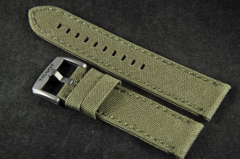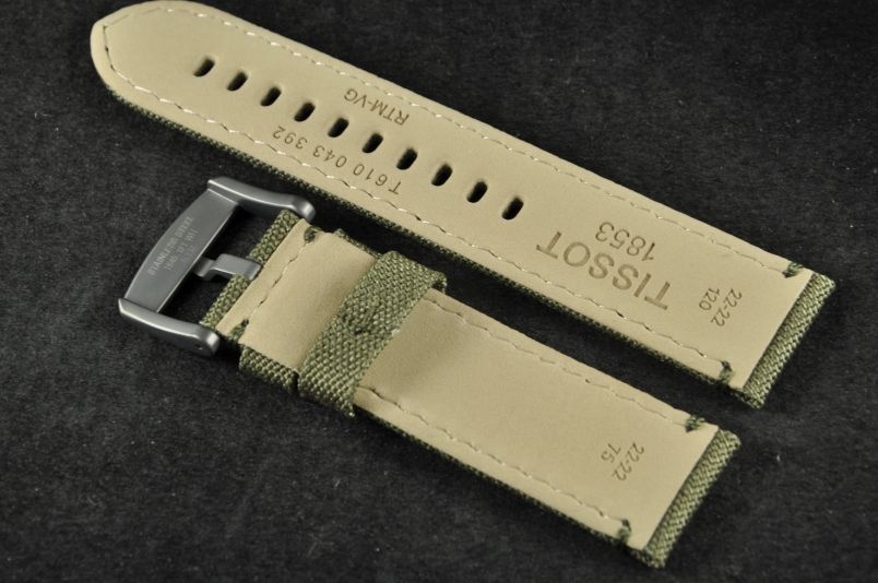 Oryginalny pasek marki Tissot, wykonany z gęsto tkanego materiału, futrówka ze skóry naturalnej. Przeszyty nicią pod kolor paska. Podwójna szlufka, stalowa masywna klamerka z logo Tissot.