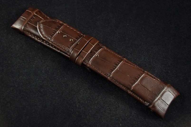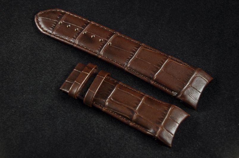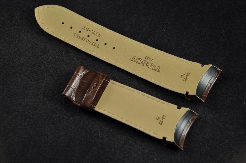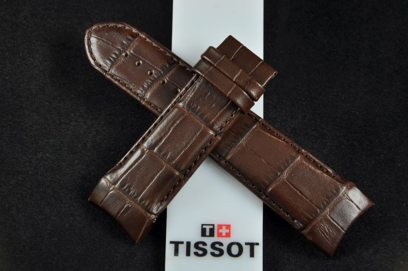 Oryginalny pasek marki Tissot, wykonany ze skóry. Faktura skóry aligatora, półmatowy. Przeszyty brązową nicią. Specjalnie profilowany. Podwójna szlufka. Pasek do zapięcia typu motylek. Sprzedawany jest sam pasek.