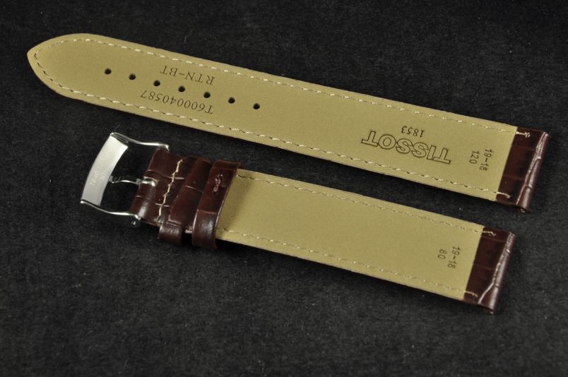 Oryginalny pasek marki Tissot, wykonany ze skóry tłoczonej na wzór skóry aligatora. Pasek z delikatnym połyskiem. Przeszyty nicią pod kolor paska. Dwie szlufki. Stalowa klamerka z logo.