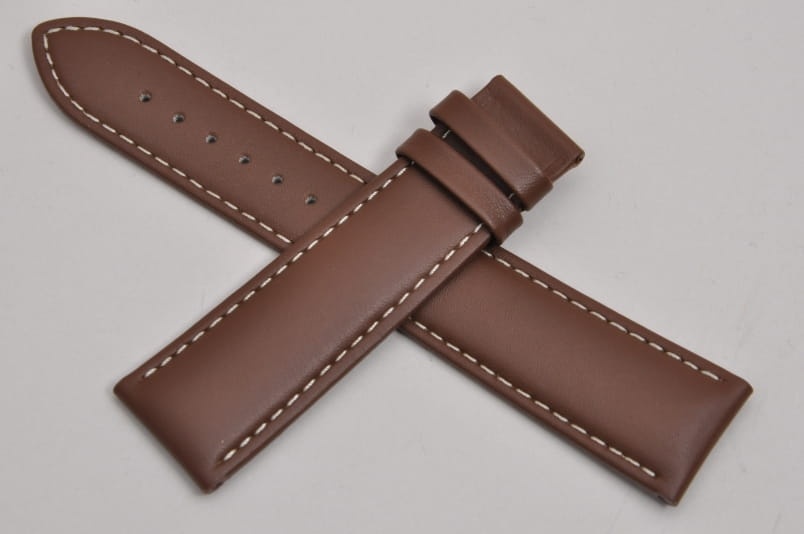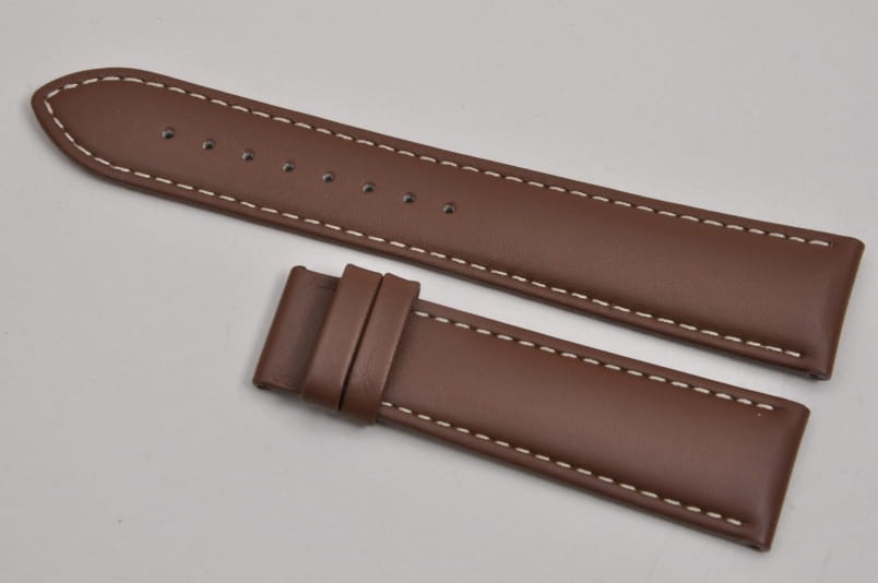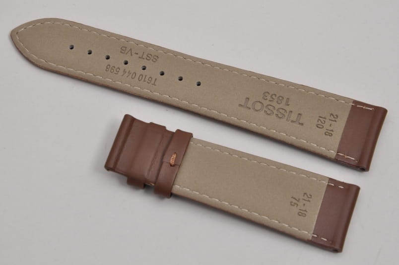 Oryginalny pasek marki Tissot, wykonany ze skóry. Gładki, matowy pasek. Pogrubiany przy zegarku, dalej cieniowany pod zapięcie. Przeszyty jasną, beżową nicią. Podwójna szlufka. Mocowany na sztyfty, w pasku znajdują się tulejki wzmacniające. Sprzedawany sam pasek bez zapięcia.