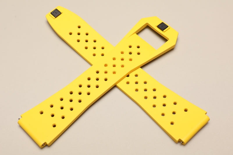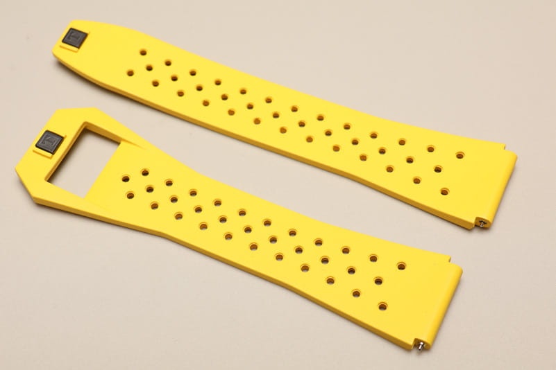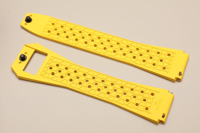 Oryginalny pasek marki Tissot, wykonany z jednokolorowej gumy. Z wierzchu gładki od dołu żłobienie ułatwiające odpływ wilgoci. Na całej długości paska otwory ułożone w trzech liniach, z których środkowa służy do blokowania zapięcia. Jedna część paska wycięta na kształt klamerki z zamontowanym na stałe bolcem wciskanym w te otwory. Drugi taki sam zastępuje szlufkę ustalając długość zapiętego paska. Wbudowane szybkie teleskopy do łatwej zmiany.