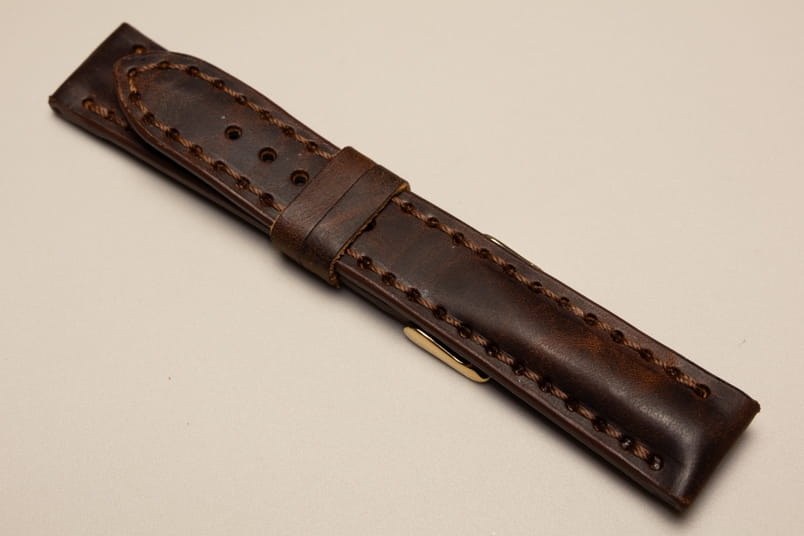 Pogrubiony od strony zegarka od 8,70mm do 5,60mm w odległości 5,5cm, dalej fragment z dziurkami grubości 3,3mm. Licowa, odporna na wilgoć futrówka w kolorze czarnym, dwie szlufki. Dedykowany do dużych, masywnych zegarków np. Breitling. Możliwość przełożenia oryginalnej klamerki.