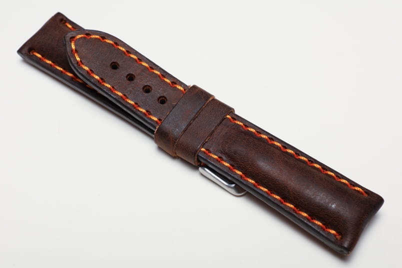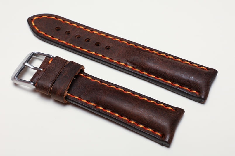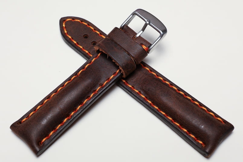 Pasuje do zegarków z mocowaniem 20mm oraz klamerką o szerokości 18mm. Wykonany z pięknej naturalnej skóry z lekkim połyskiem, przeszyty pomarańczową nicią.
