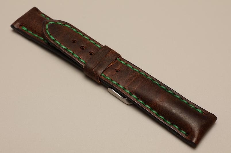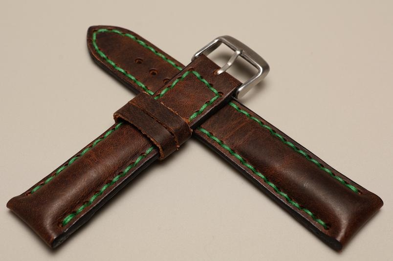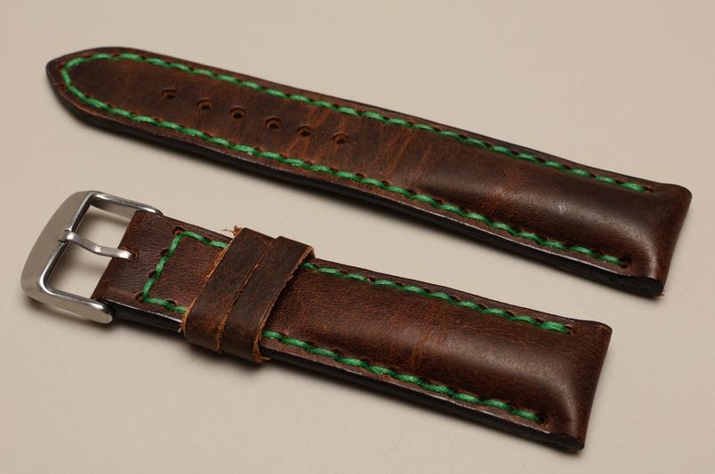 Pasuje do zegarków z mocowaniem 22mm oraz klamerką o szerokości 20mm. Wykonany z pięknej naturalnej skóry z lekkim połyskiem, przeszyty zieloną nicią.