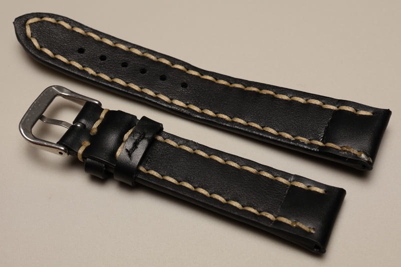 Pogrubiony od strony zegarka od 6,60mm do 5,20mm w odległości 4cm, dalej fragment z dziurkami grubości 3,3mm. Licowa, odporna na wilgoć futrówka w kolorze czarnym, dwie szlufki. Dedykowany do dużych, masywnych zegarków np. Breitling. Możliwość przełożenia oryginalnej klamerki.