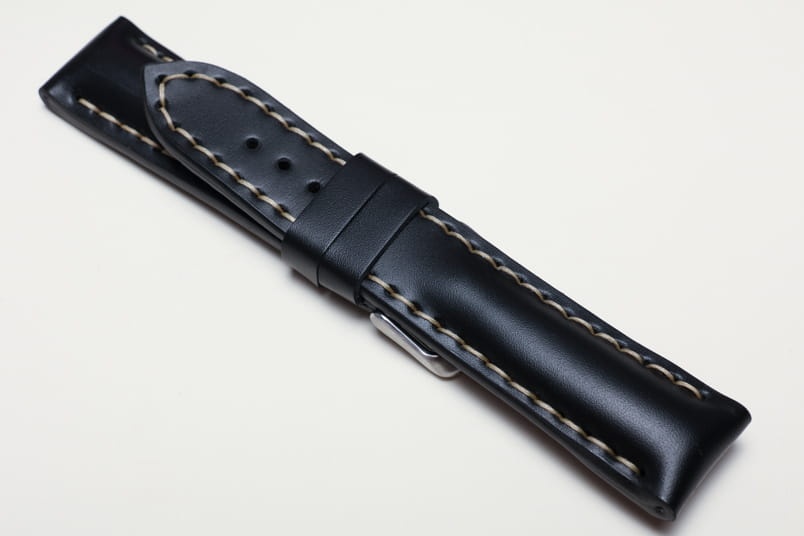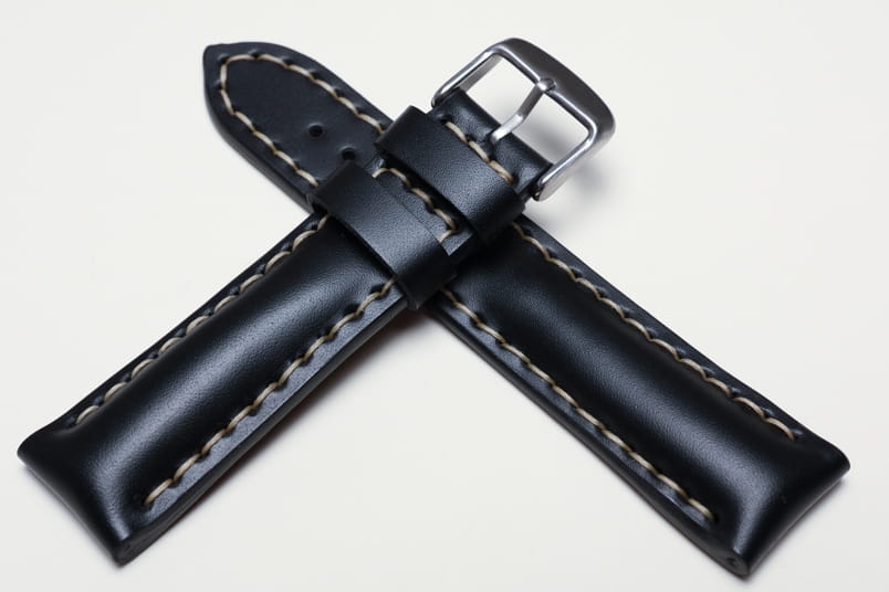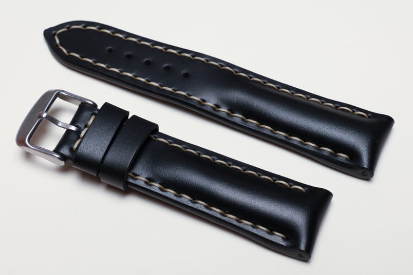 Pogrubiony od strony zegarka od 8,70mm do 5,60mm w odległości 5,5cm, dalej fragment z dziurkami grubości 3,3mm. Licowa, odporna na wilgoć futrówka w kolorze czarnym, dwie szlufki. Dedykowany do dużych, masywnych zegarków np. Breitling. Możliwość przełożenia oryginalnej klamerki.