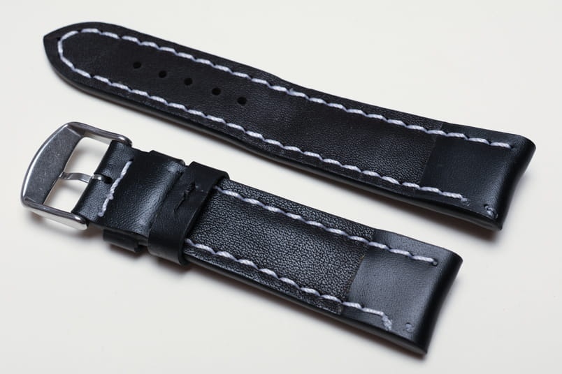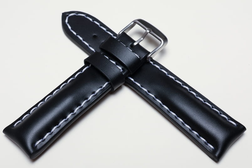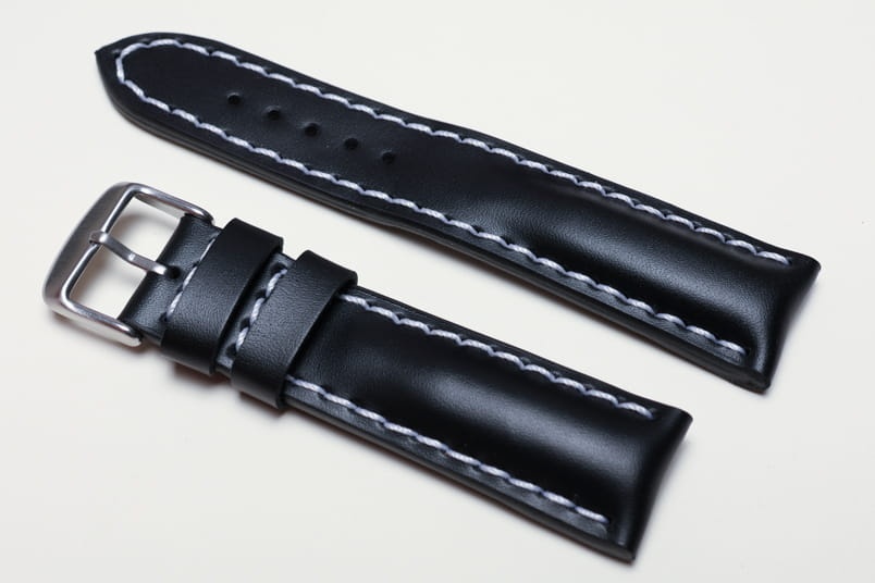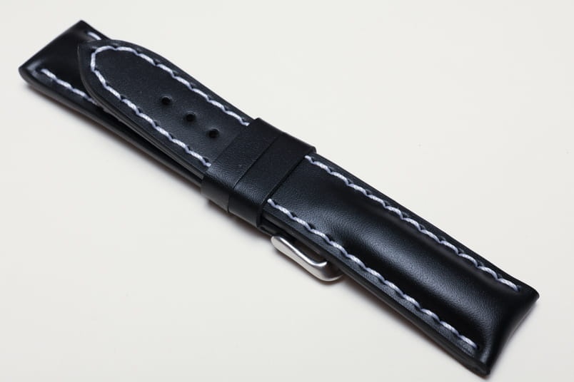 Pogrubiony od strony zegarka od 8,70mm do 5,60mm w odległości 5,5cm, dalej fragment z dziurkami grubości 3,3mm. Licowa, odporna na wilgoć futrówka w kolorze czarnym, dwie szlufki. Dedykowany do dużych, masywnych zegarków np. Breitling. Możliwość przełożenia oryginalnej klamerki.