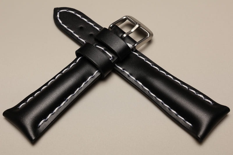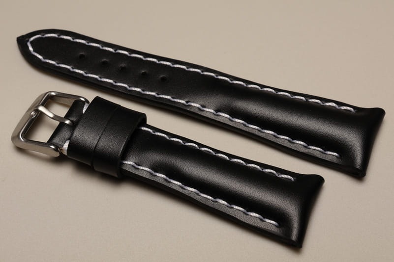 Pogrubiony od strony zegarka od 8,70mm do 5,60mm w odległości 5,5cm, dalej fragment z dziurkami grubości 3,3mm. Licowa, odporna na wilgoć futrówka w kolorze czarnym, dwie szlufki. Dedykowany do dużych, masywnych zegarków np. Breitling. Możliwość przełożenia oryginalnej klamerki.