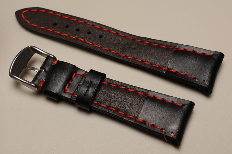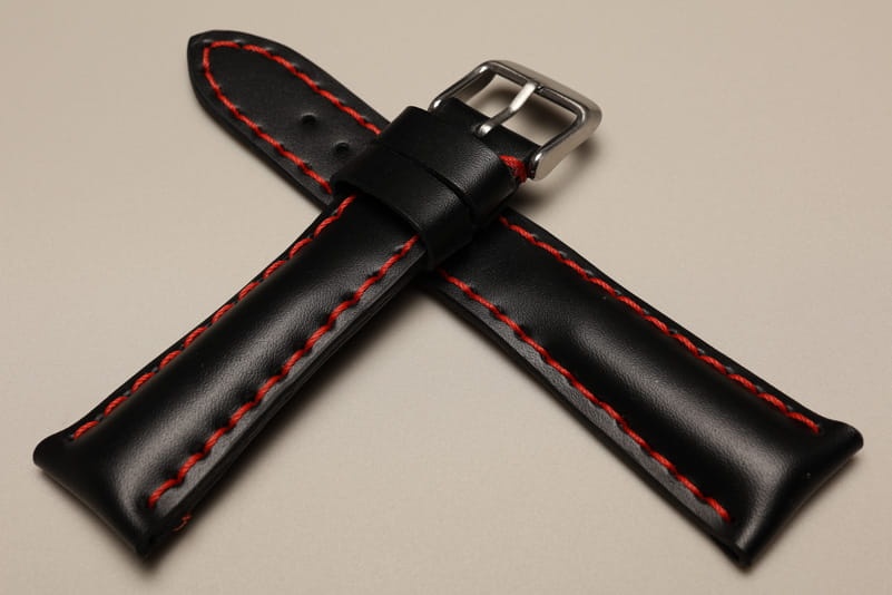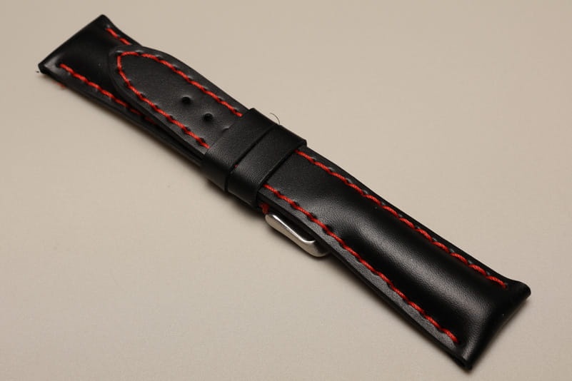 Pasuje do zegarków z mocowaniem 24mm oraz klamerką o szerokości 18mm. Wykonany z pięknej naturalnej skóry z lekkim połyskiem, przeszyty czerwoną nicią.