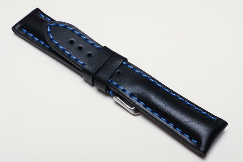 Pogrubiony od strony zegarka od 8,70mm do 5,60mm w odległości 5,5cm, dalej fragment z dziurkami grubości 3,3mm. Licowa, odporna na wilgoć futrówka w kolorze czarnym, dwie szlufki. Dedykowany do dużych, masywnych zegarków np. Breitling. Możliwość przełożenia oryginalnej klamerki.
