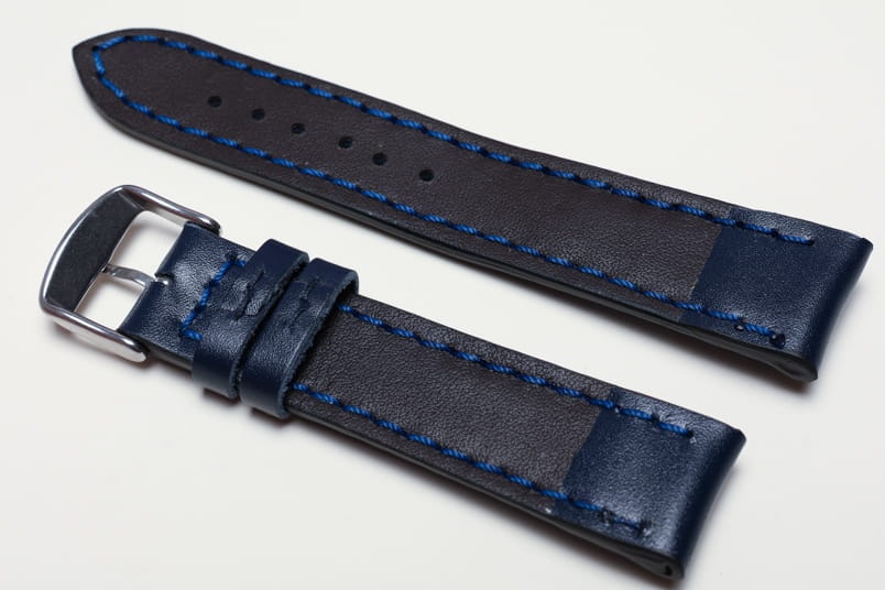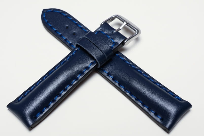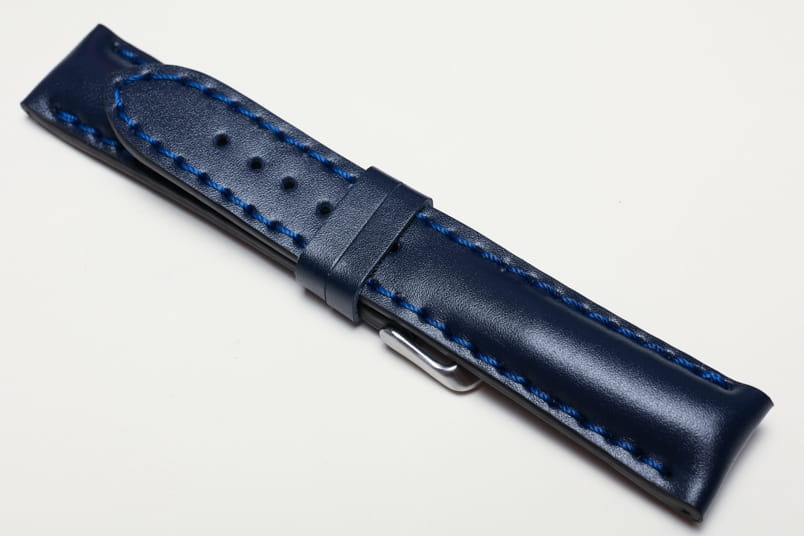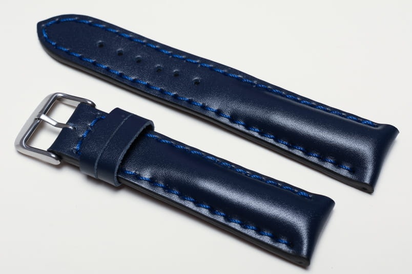 Pasuje do zegarków z mocowaniem 22mm oraz klamerką o szerokości 20mm. Wykonany z pięknej naturalnej skóry z lekkim połyskiem, przeszyty niebieską nicią.