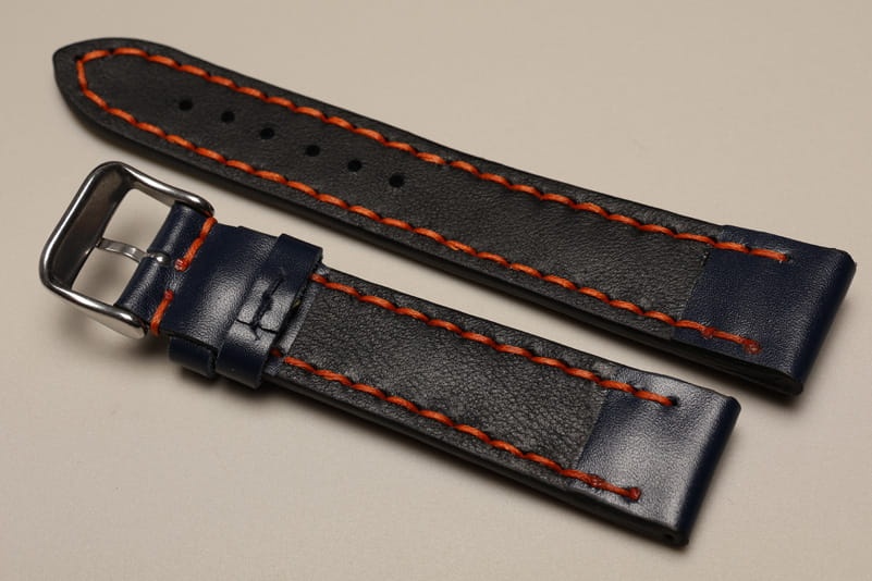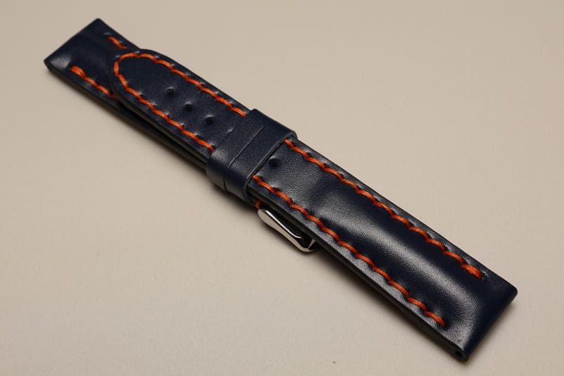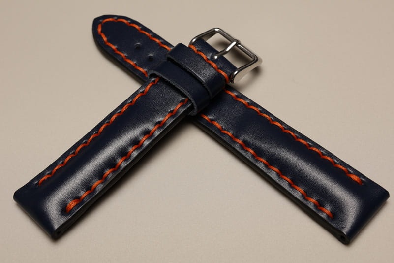 Pasuje do zegarków z mocowaniem 20mm oraz klamerką o szerokości 18mm. Wykonany z pięknej naturalnej skóry z lekkim połyskiem, przeszyty pomarańczową nicią.