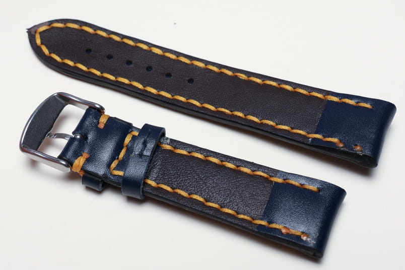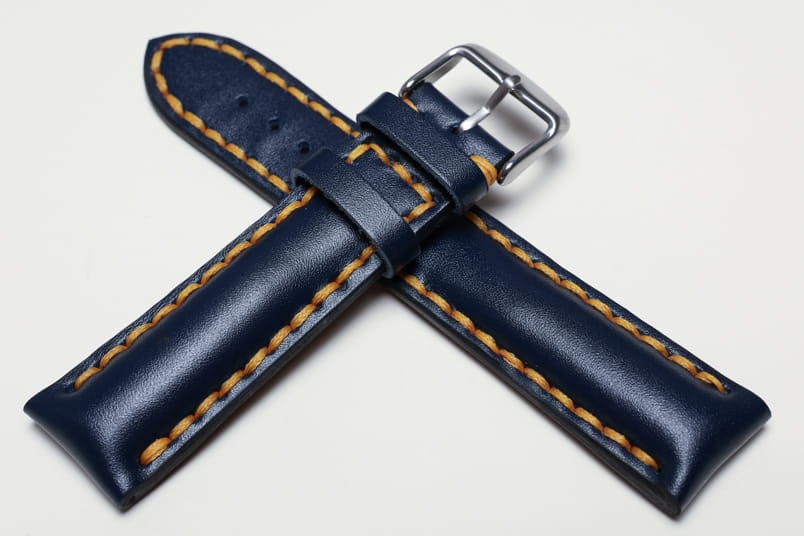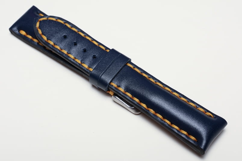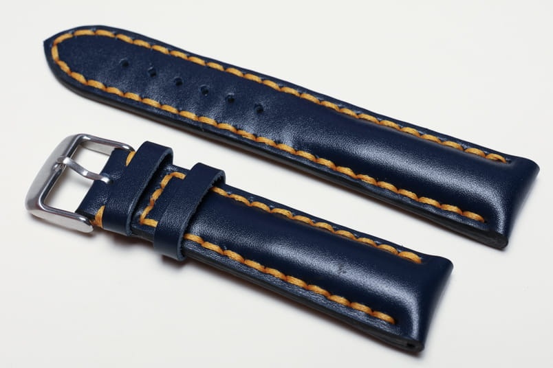 Pasuje do zegarków z mocowaniem 22mm oraz klamerką o szerokości 20mm. Wykonany z pięknej naturalnej skóry z lekkim połyskiem, przeszyty pomarańczową nicią.