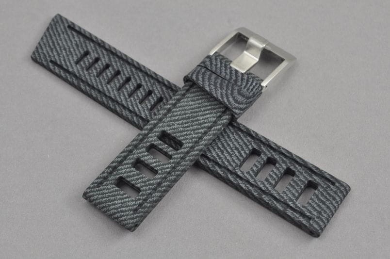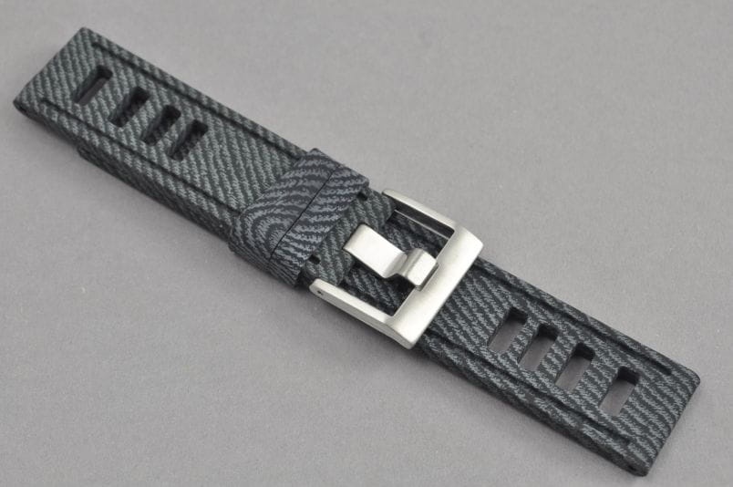 Wykonany ze sztywniejszego silikonu, w jednolitym kolorze, wierzch ze wzorem tkaniny jeansowej. Perforowany, Dwie szlufki, stalowa masywna klamerka mocowana na śrubkę.