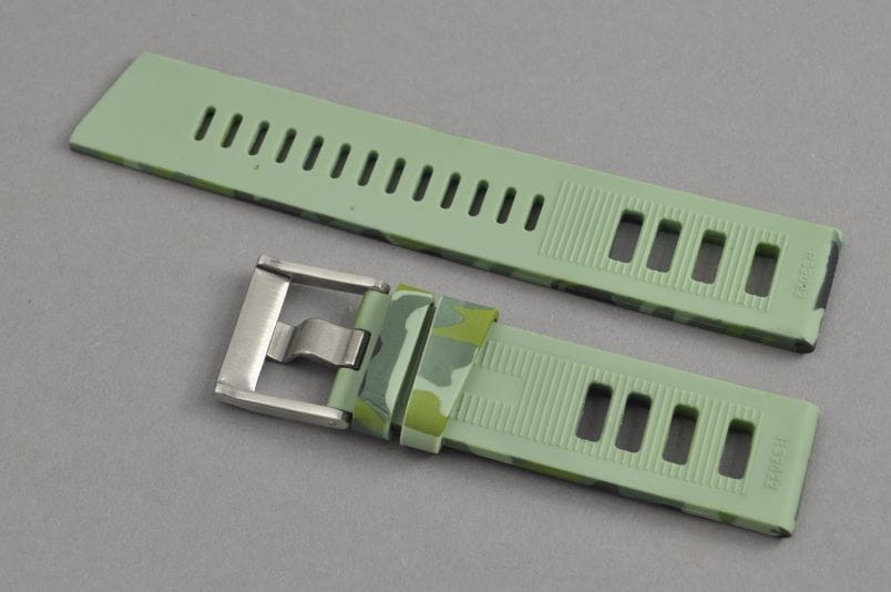 Wykonany ze sztywniejszego silikonu, zielony z nadrukiem wzoru moro. Perforowany, Dwie szlufki, stalowa masywna klamerka mocowana na śrubkę.