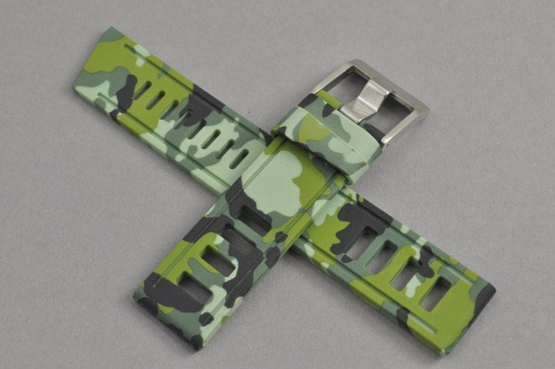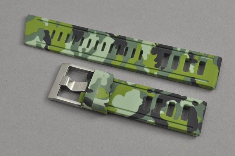 Wykonany ze sztywniejszego silikonu, zielony z nadrukiem wzoru moro. Perforowany, Dwie szlufki, stalowa masywna klamerka mocowana na śrubkę.