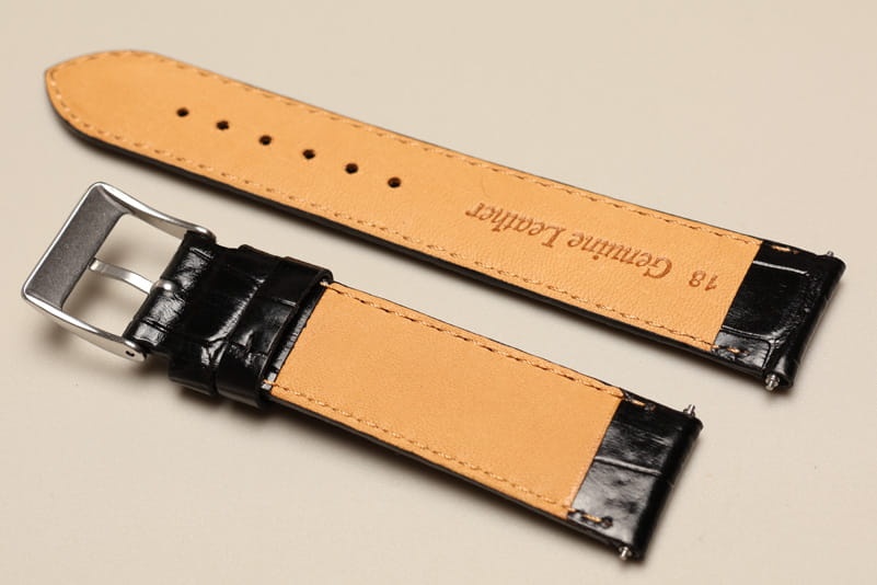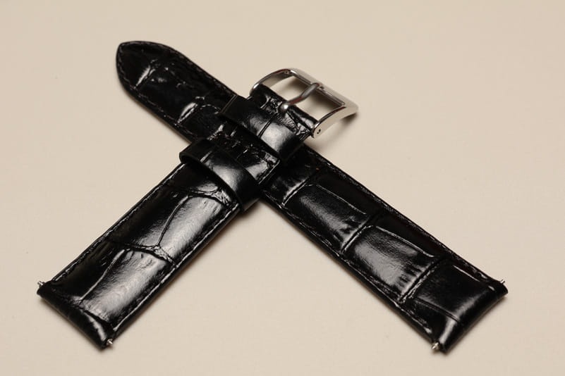 Pasek do zegarków z mocowaniem 18mm. Wykonany z naturalnej skóry cielęcej. Wzór skóry aligatora z połyskiem. Przeszyty nicią w kolorze paska. Podwójna szlufka. Specjalna krótka wersja.