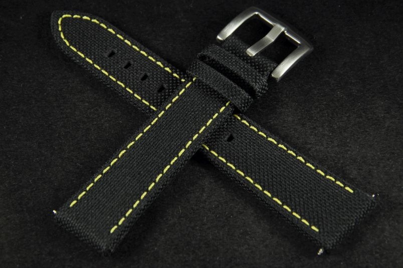 Pasek do zegarka wykonany z tkaniny typu canvas. Przeszyty żółtą nicią. Lekko pogrubiany, 4,2mm grubości przy mocowaniu, 3,2mm grubości w dalszej części. Dwie szlufki. Futrówka z czarnej, gładkiej skóry. Stalowa, satynowa klamerka.