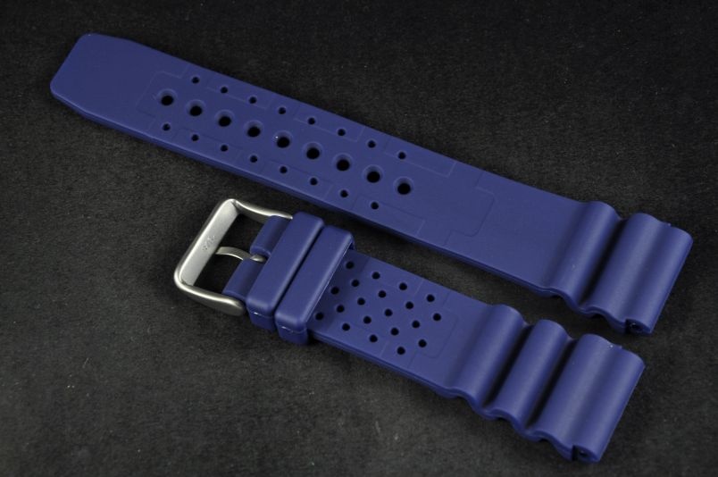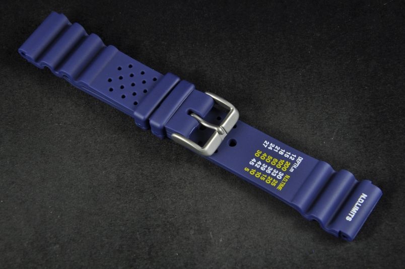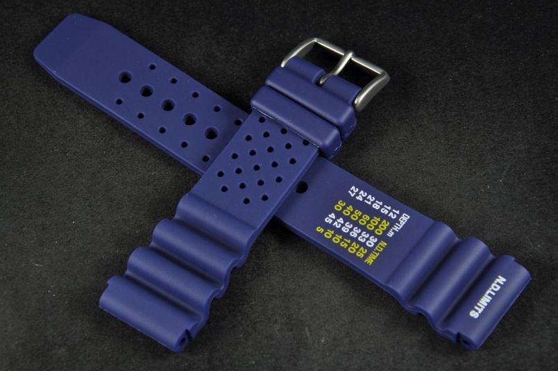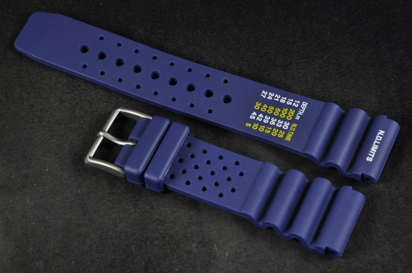 Pasek wykonany ze stosunkowo miękkiej gumy w kolorze niebieskim. Ozdobny szlaczek przy mocowaniu. Nadrukowana tabela N.D. Limits. Stalowa klamerka, dwie luźne szlufki. Idealny do sportów wodnych i nurkowania. Pasuje do większości zegarków z mocowaniem 20mm. Pasek ma duży otwór na teleskop typu Seiko.