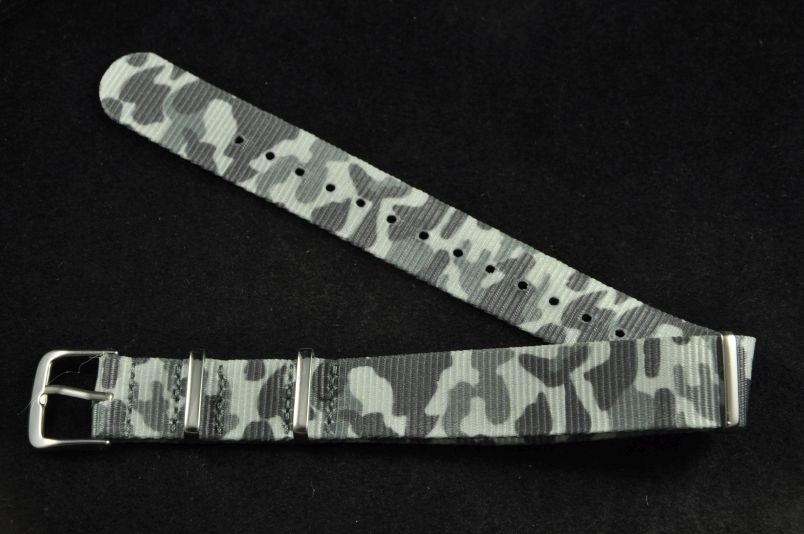 Pasek do zegarka typu Nato. Wykonany z nylonowego materiału. Wielokolorowy wzór typu moro. Pasek do zegarków sportowych i wojskowych. Wodoodporny. Szlufki i klamerka w kolorze stalowym.