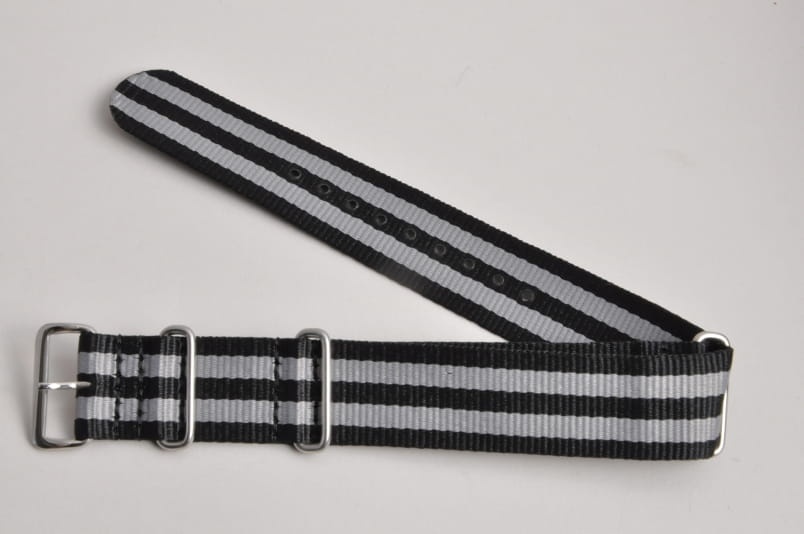 Pasek do zegarka typu Nato. Wykonany z nylonowego materiału. Na środku dwa szare paski na całej długości. Pasek do zegarków sportowych i wojskowych. Wodoodporny. Stalowa klamerka mocowana na stałe.