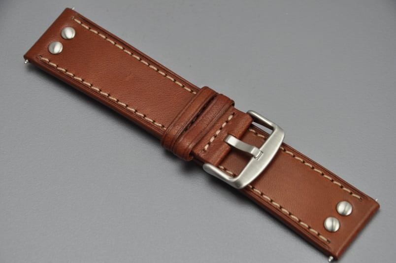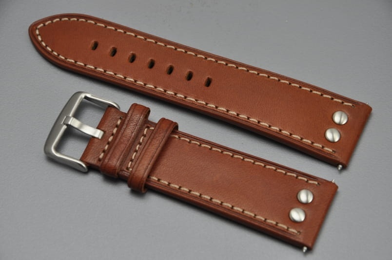 Pasek typu Pilot z nitami, Skórzany, Brązowy, 24mm