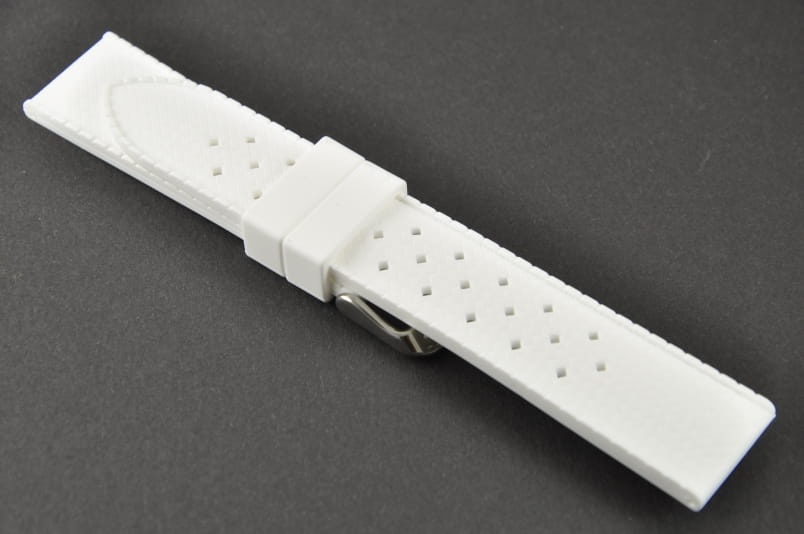Silikonowy pasek typu Tropic. Charakterystyczne drobne dziurki, delikatny wzór na wierzchu. Lekko pogrubiany do 4mm. Dwie szlufki. Stalowa klamerka.