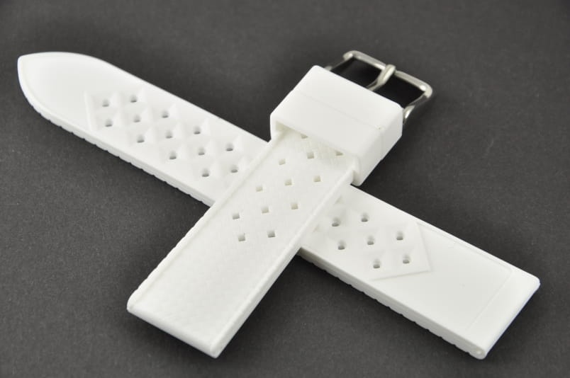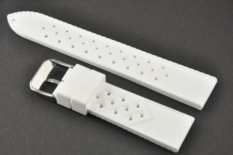 Silikonowy pasek typu Tropic. Charakterystyczne drobne dziurki, delikatny wzór na wierzchu. Lekko pogrubiany do 4mm. Dwie szlufki. Stalowa klamerka.